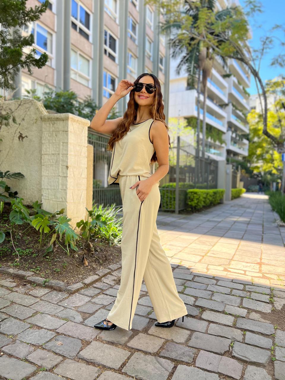 Calça de corte reto em tecido leve, com cós de elástico que garante conforto e caimento descomplicado. O detalhe do vivo branco na lateral alonga a silhueta e adiciona um toque moderno e elegante. Perfeita para compor looks do dia a dia com praticidade e estilo.