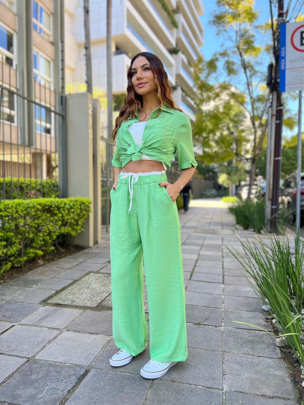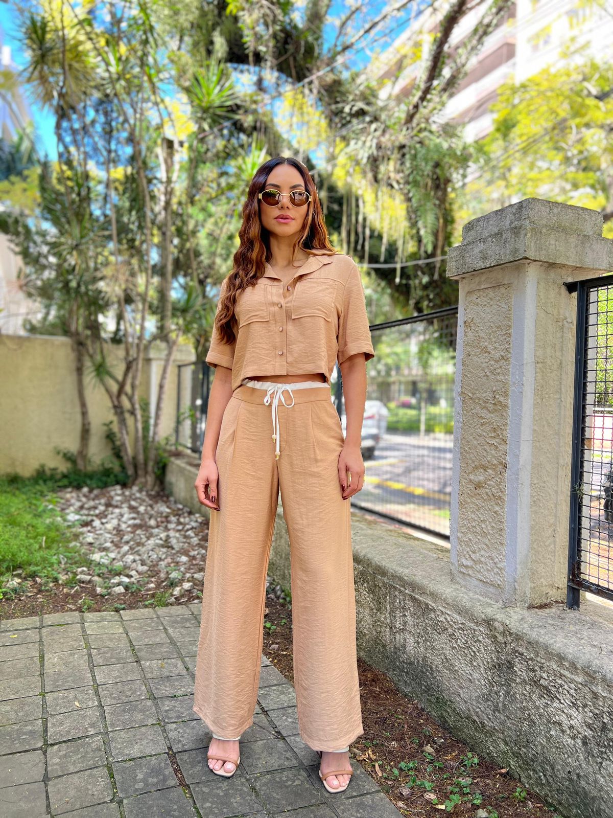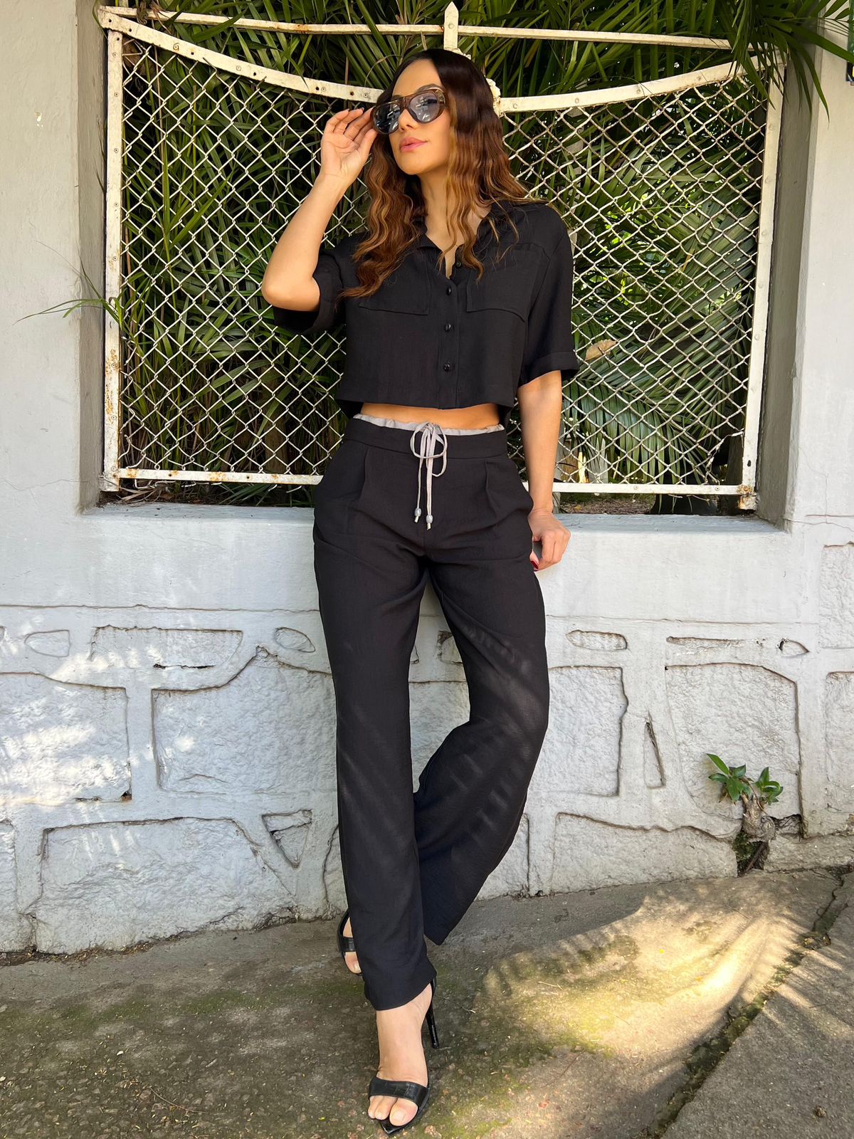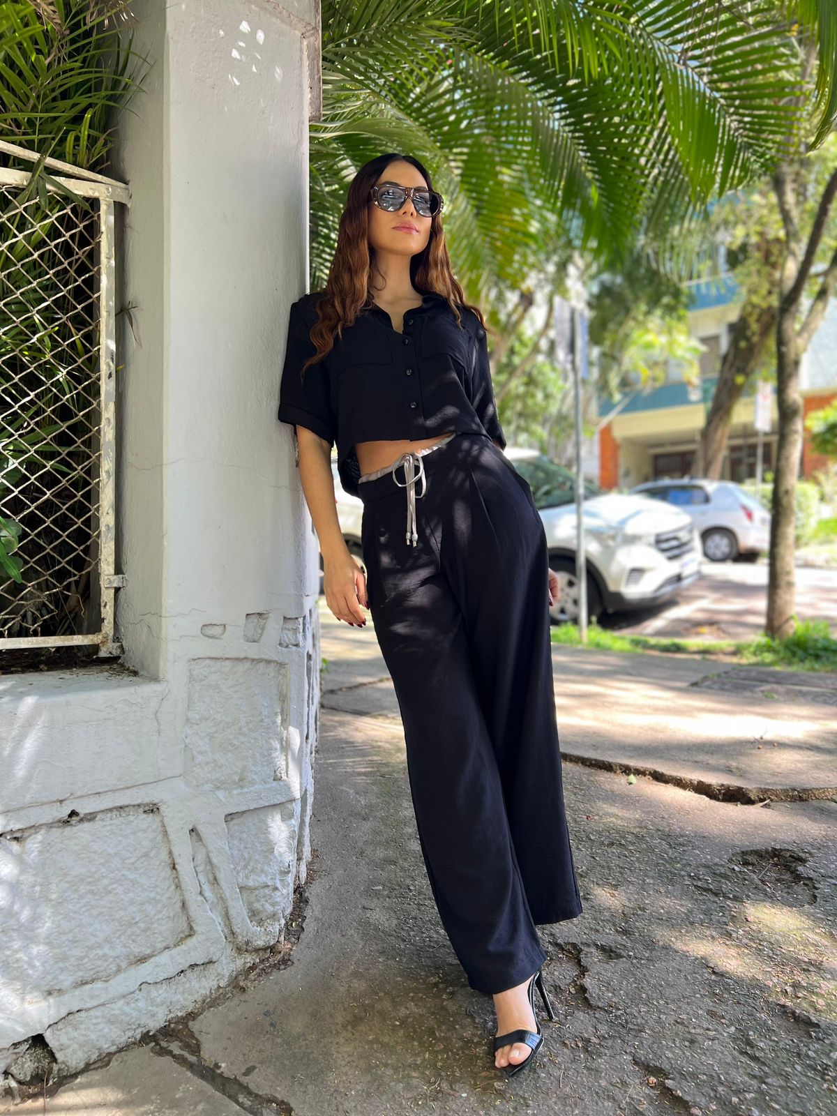 A pantalona garante movimento e sofisticação ao look. O detalhe bicolor no cós com amarração traz contraste e charme extra, equilibrando conforto e estilo. Versátil, é a peça que transita do casual ao elegante com facilidade.