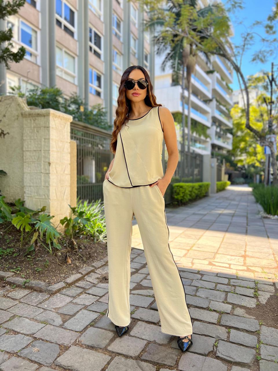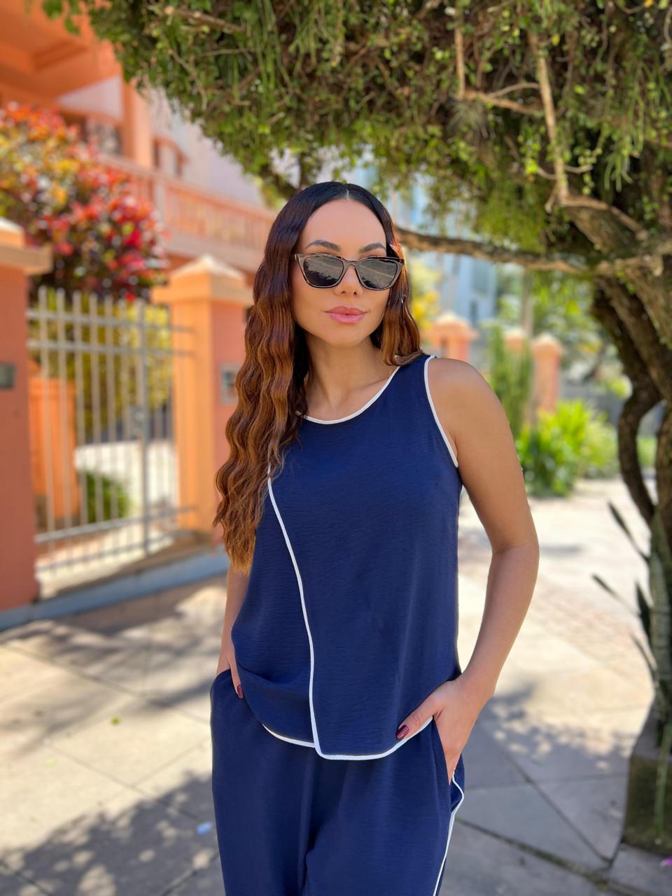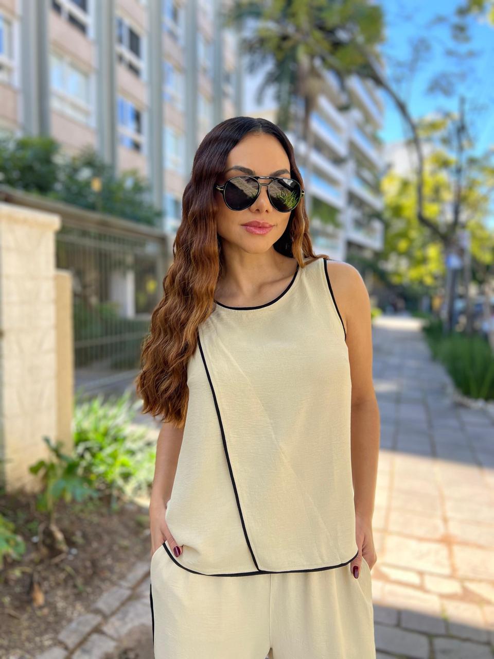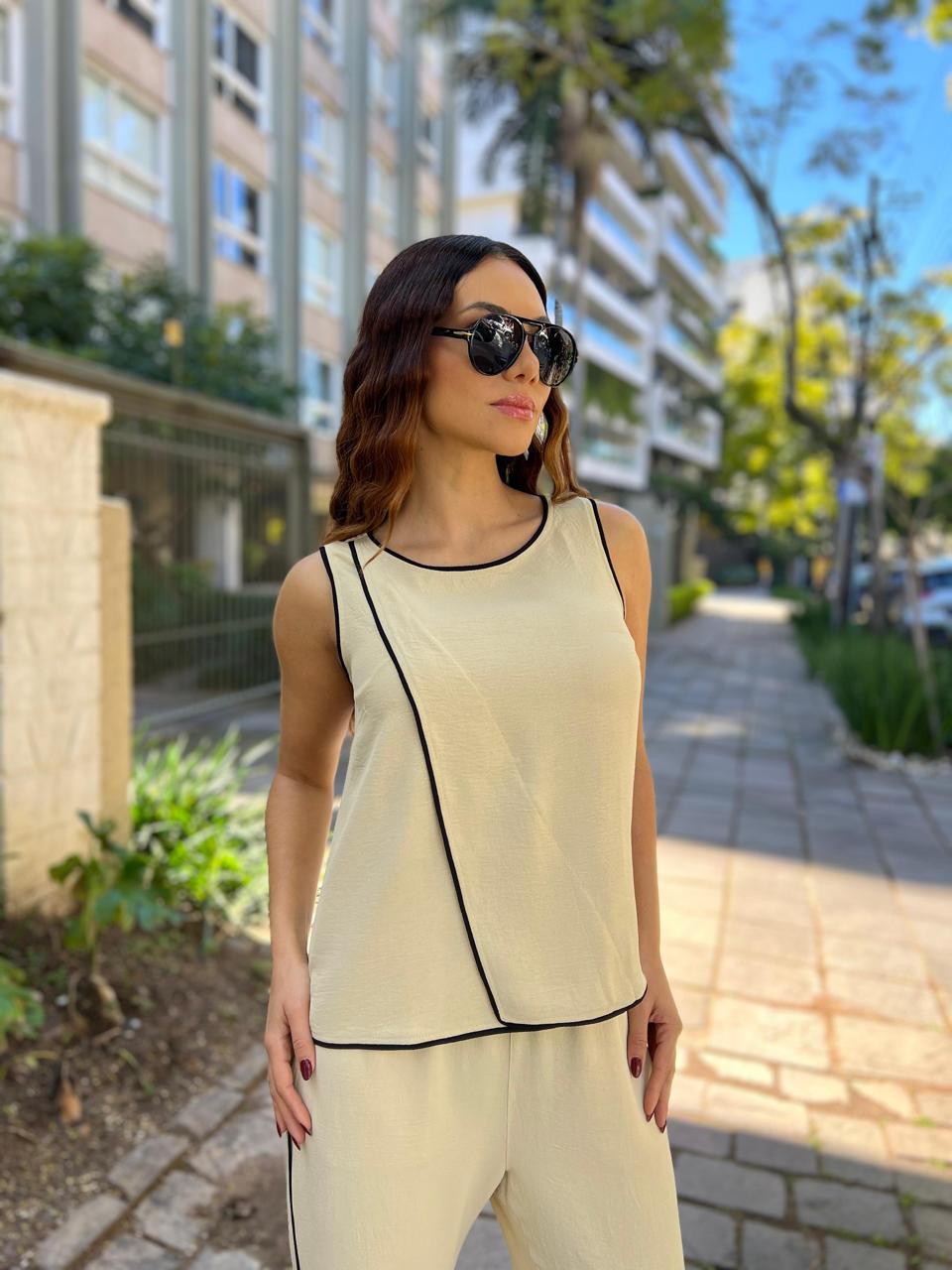 Regata em modelagem soltinha, sem mangas, confeccionada em tecido fluido. O vivo branco frontal traz contraste moderno e valoriza o design minimalista da peça. Versátil e atemporal, pode ser usada tanto em produções casuais quanto em composições mais elegantes.